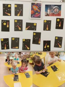Воспитанники младшей группы №3 готовились к празднику ” День космонавтики “. На занятии составили композицию ” Ракета летит в космос”.
