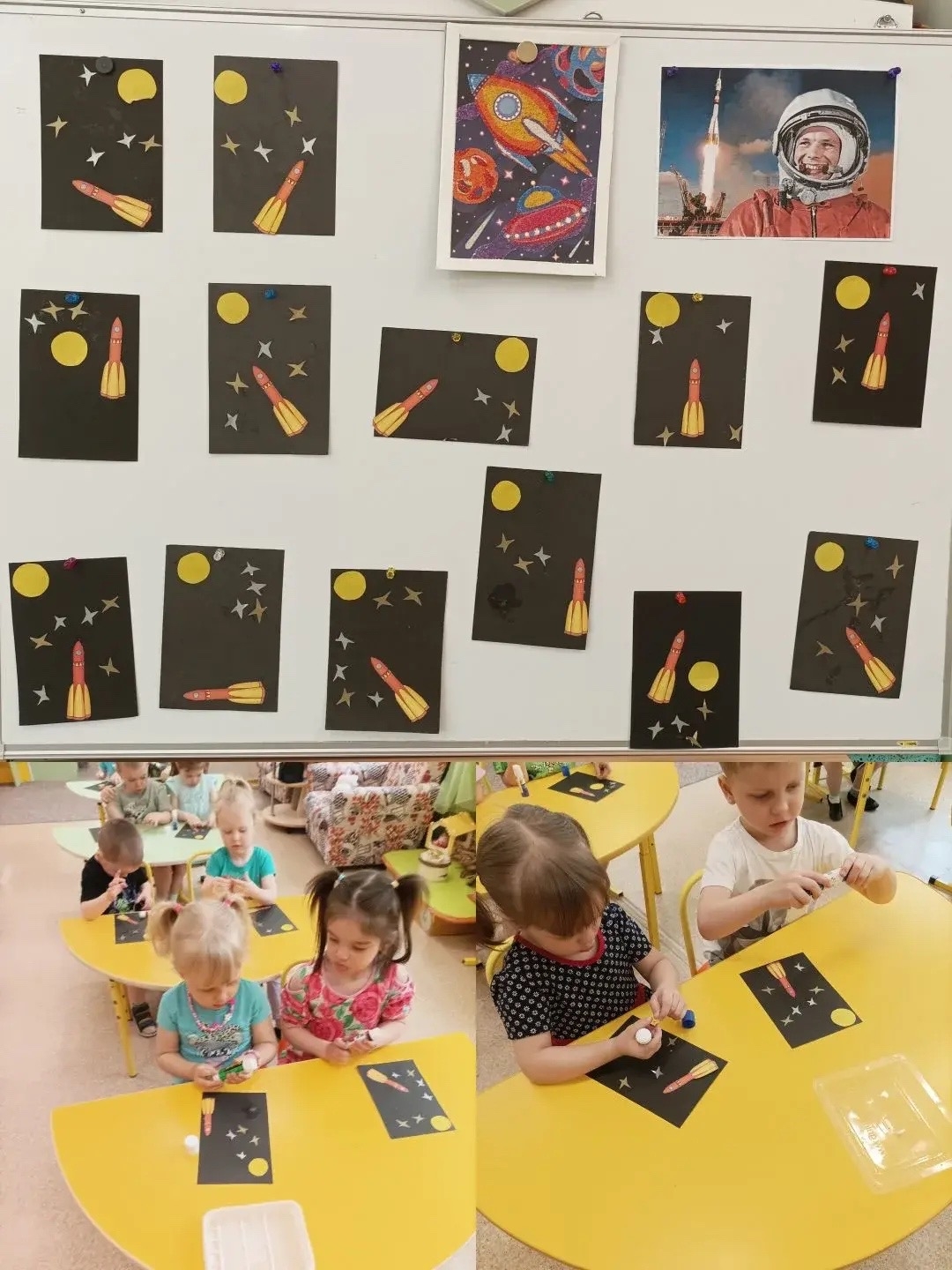Ребята самостоятельно клеили звезды, солнце, ракету. Малыши с большим удовольствием выполняли аппликацию.