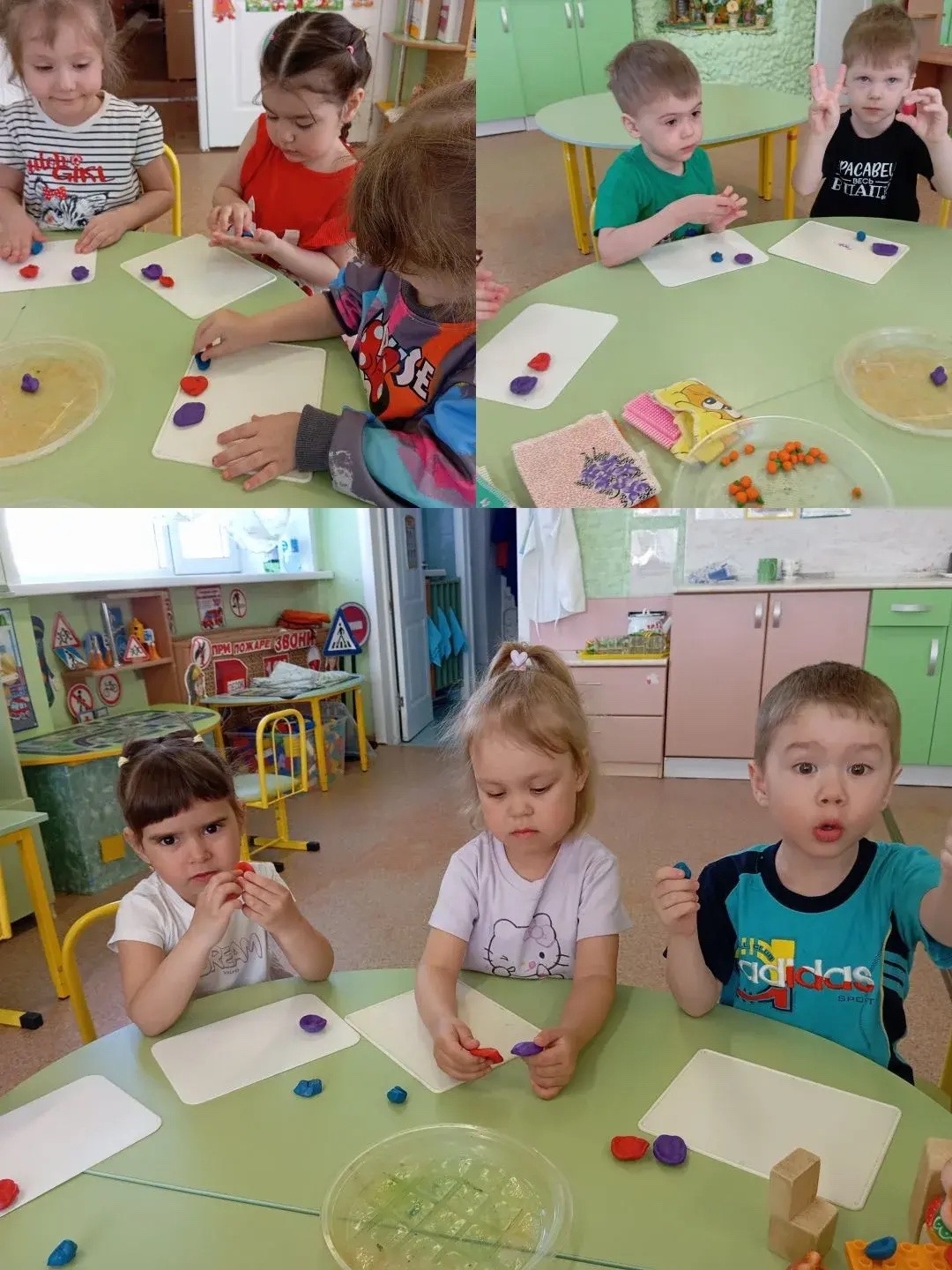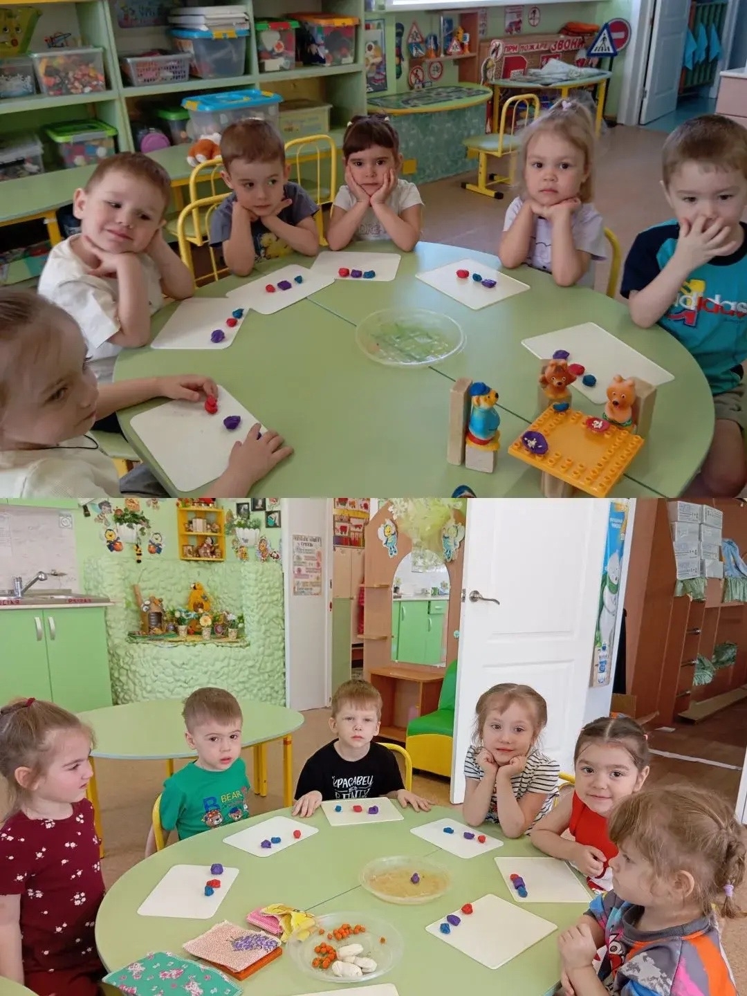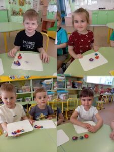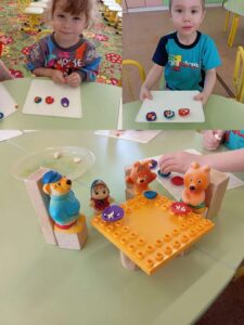 Занятие направлено на развитие мелкой моторики и умения различать величину( большой, средний и маленький). Дети учились скатывать пластилин в шары, сплющивать их и делать углубление, создавая посуду для Михаила Ивановича, Настасья Петровны и Мишутки. Занятия включало игровой момент с персонажами сказки.